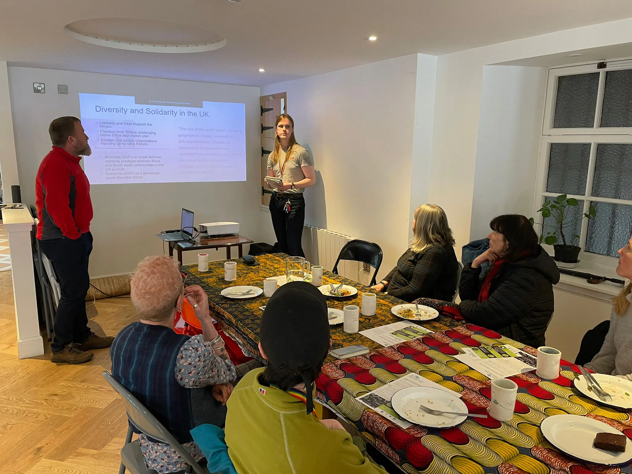 Abhainn Macleod from Four Pillars and Berkeley Wilde from The Diversity Trust joined us for a collaborative talk about the International Day Against Homophobia, Biphobia & Transphobia which is celebrated across the world on 17th May. They discussed this year’s IDAHOBIT theme: “Together always: united in diversity”, sharing facts, stats and the journeys of solidarity movements aligned with the LGBTQ+ communities including the intersections of race, class, gender and other struggles for liberation. Lunch by Kawther Luay: cabbage & carrot stir-fry, barley rice, red onion raita, chocolate peanut butter brownies About Friday LunchThe sharing of food is a great leveller. Every other Friday, we invite people to speak about topics that relate to art, ecology, birds, politics or many other threads of Huntly life. At 1pm our team, along with artists and whoever else wants to join us, have lunch together and get involved in this sharing of knowledge. All are welcome to join - just turn up on the day! We have a donations pot at this event, and suggest a donation of £2 which goes towards the cost of ingredients and any access needs for the speaker. More info can be found below the programme of speakers. Home ProgrammeThis event is part of the Home Programme, a series of regular community events taking place at Deveron Projects programmed by our Art & Community Worker. The Home Programme celebrates local knowledge and experience, and explores what it's like to live and work in and around Huntly. It includes Friday Lunch, as well as the monthly Food Chain cookery workshop and a stall at the Huntly Farmers' Market.