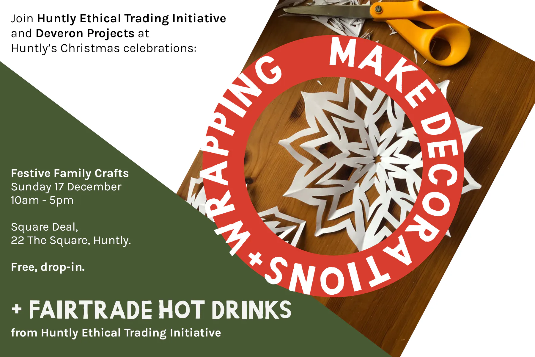 As part of Huntly’s Christmas celebrations, come along to Square Deal for some fun festive making with Deveron Projects and warming fairtrade hot drinks from Huntly Ethical Trading Initiative. We’ll be making wrapping paper, gift tags and decorations, all from recycled and reused materials. Drop in throughout the day to print, marble, construct and craft towards an up-cycled Christmas. You could even bring along some last-minute presents to wrap up with help from our elves! Huntly Ethical Trading Initiative will be offering fair trade hot drinks throughout the day, to warm you up while you head to the festive Farmers’ Market or wait for Santa and his reindeer.