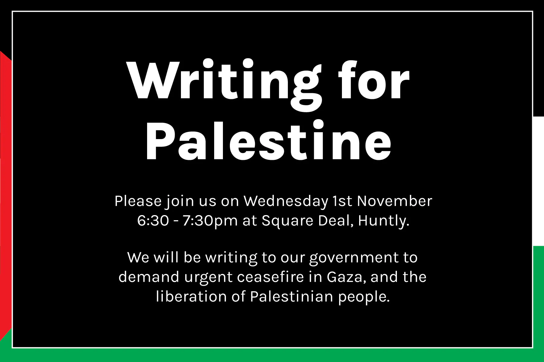 Please join us in Square Deal on Wednesday to write to our political representatives in support of Palestinian people, to raise our voices against the ongoing genocide and occupation by Israel. Although our First Minister has called for immediate ceasefire, the silence and complicity of others, including our Prime Minister and other leaders, is causing the loss of thousands of lives. If you aren’t sure what to do, are feeling helpless, overwhelmed, heartbroken and angry in the face of the suffering and violence in Gaza, this is a productive thing you can do. There is no requirement to ‘know’ lots about Palestine or the ongoing struggle – this will be a supportive and welcoming space to come together and use our collective power, learn from each other and advocate for ceasefire.