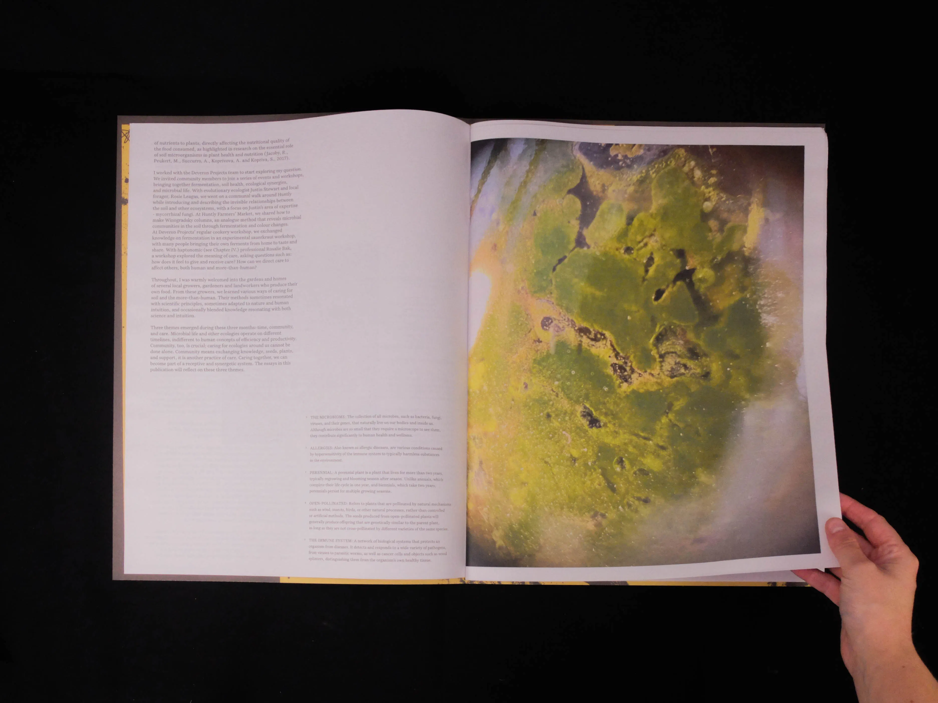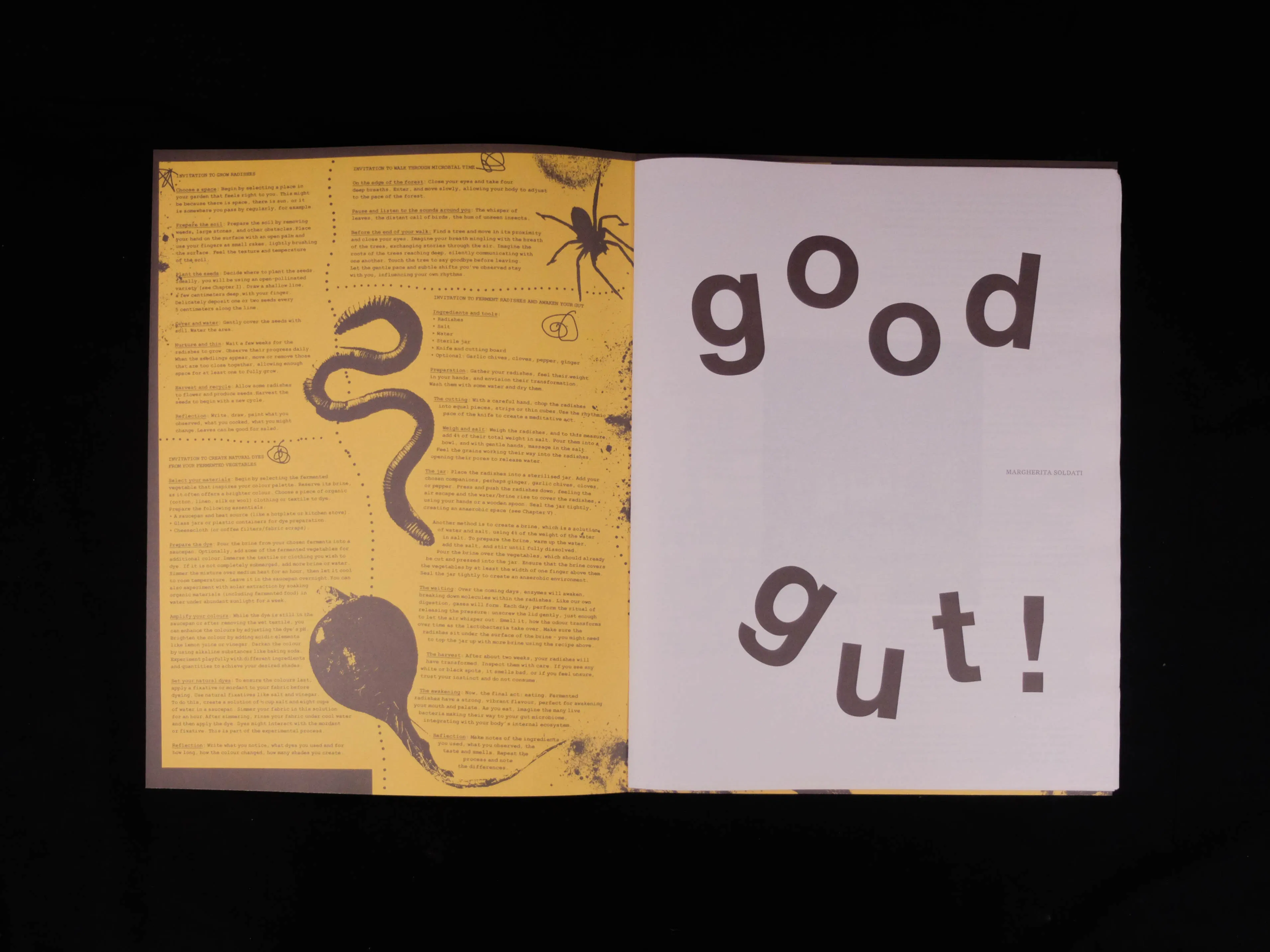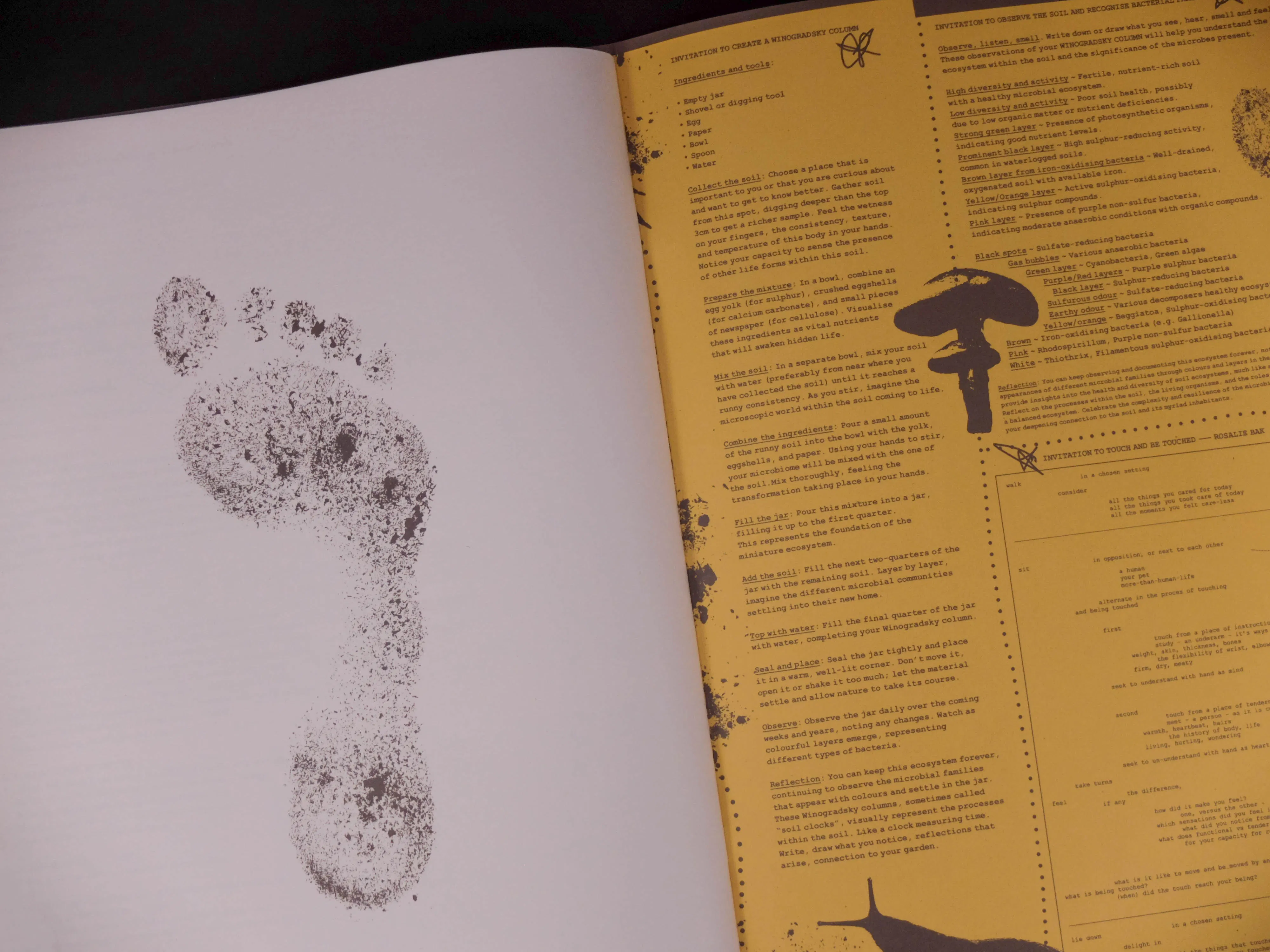 Emerging from our collaborative residency with Margherita Soldati in 2024, Good Gut! is a publication bringing together words and images exploring soil, microbial life, interconnections and (shared) biomes. As Margherita says, Good Gut! is “40 pages of words and images from my time in Scotland - exploring care for soil, the timescapes of microbial life, and collaborative practices that grew from this work. Inside are invitations to practices born during the research, portraits of ten extraordinary soil carers with stories of their relationship to the land, a collaboration on embodied care with Rosalie Bak, and an interview with Scottish soil expert Willie Towers”.