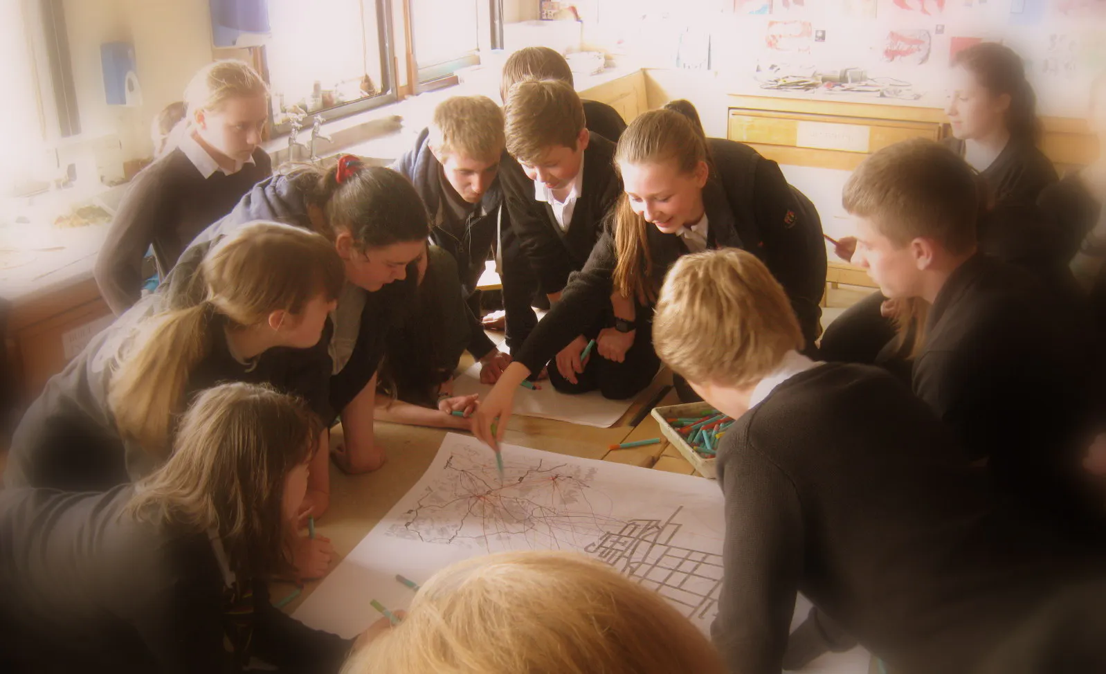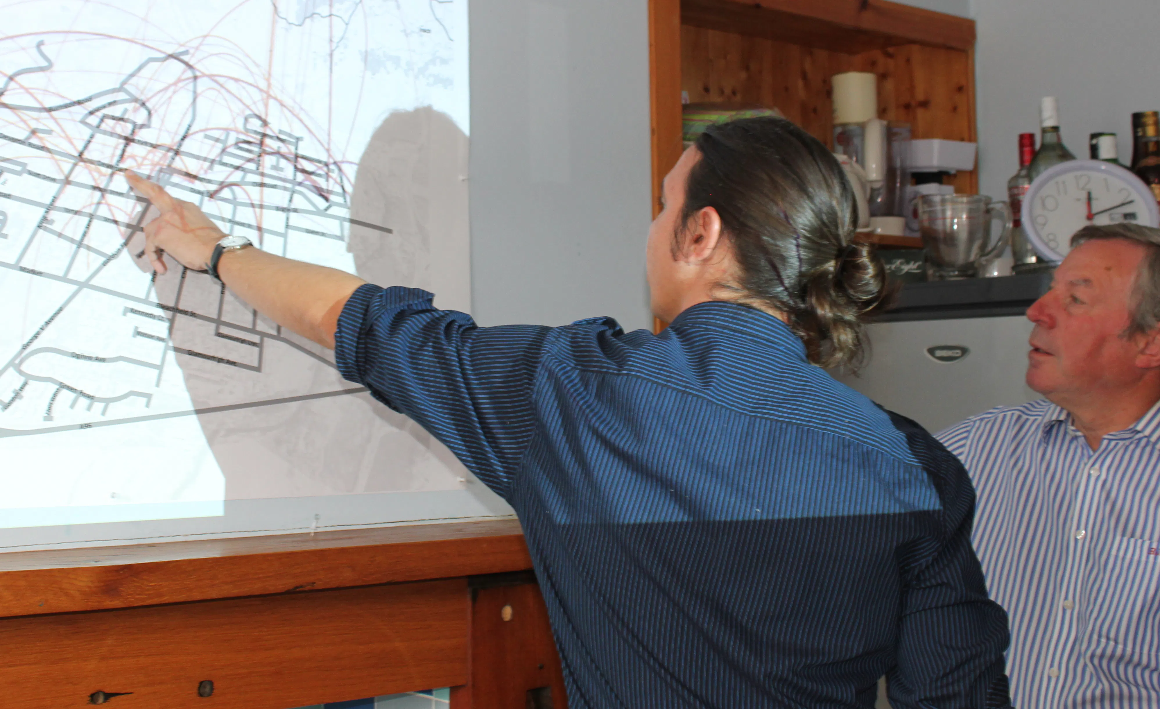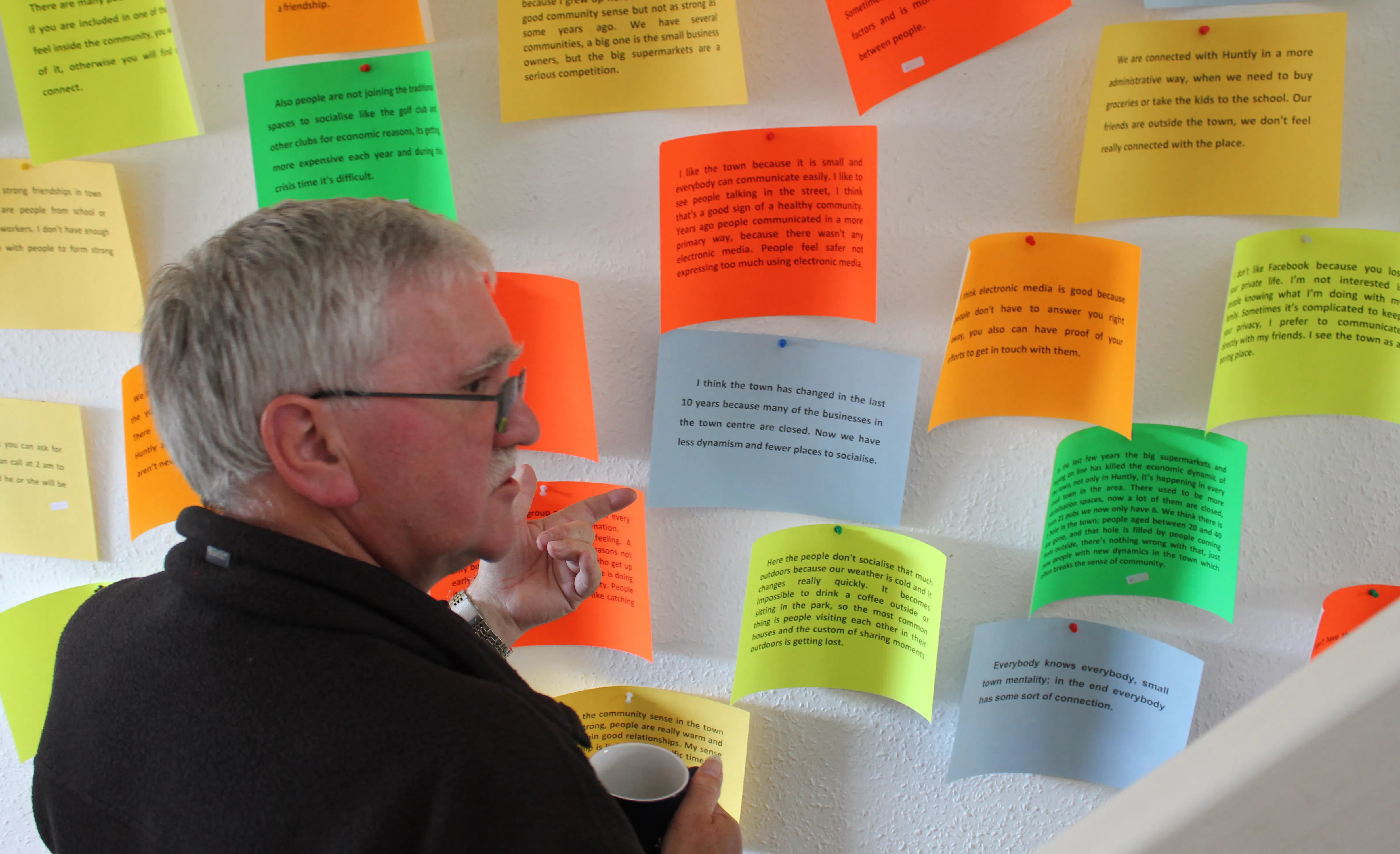 To do this the artists asked people they met in Huntly to introduce them to one of their friends, asking them again for an introduction, like a chain letter or Chinese whisper, thereby creating a human contact net, mapping all the real friendships in town. They also met people in a variety of spaces: the pub, the school, the farmer's market and the coffee morning; where people were asked to talk about their close and more distant friends with the assistance of a town map.
