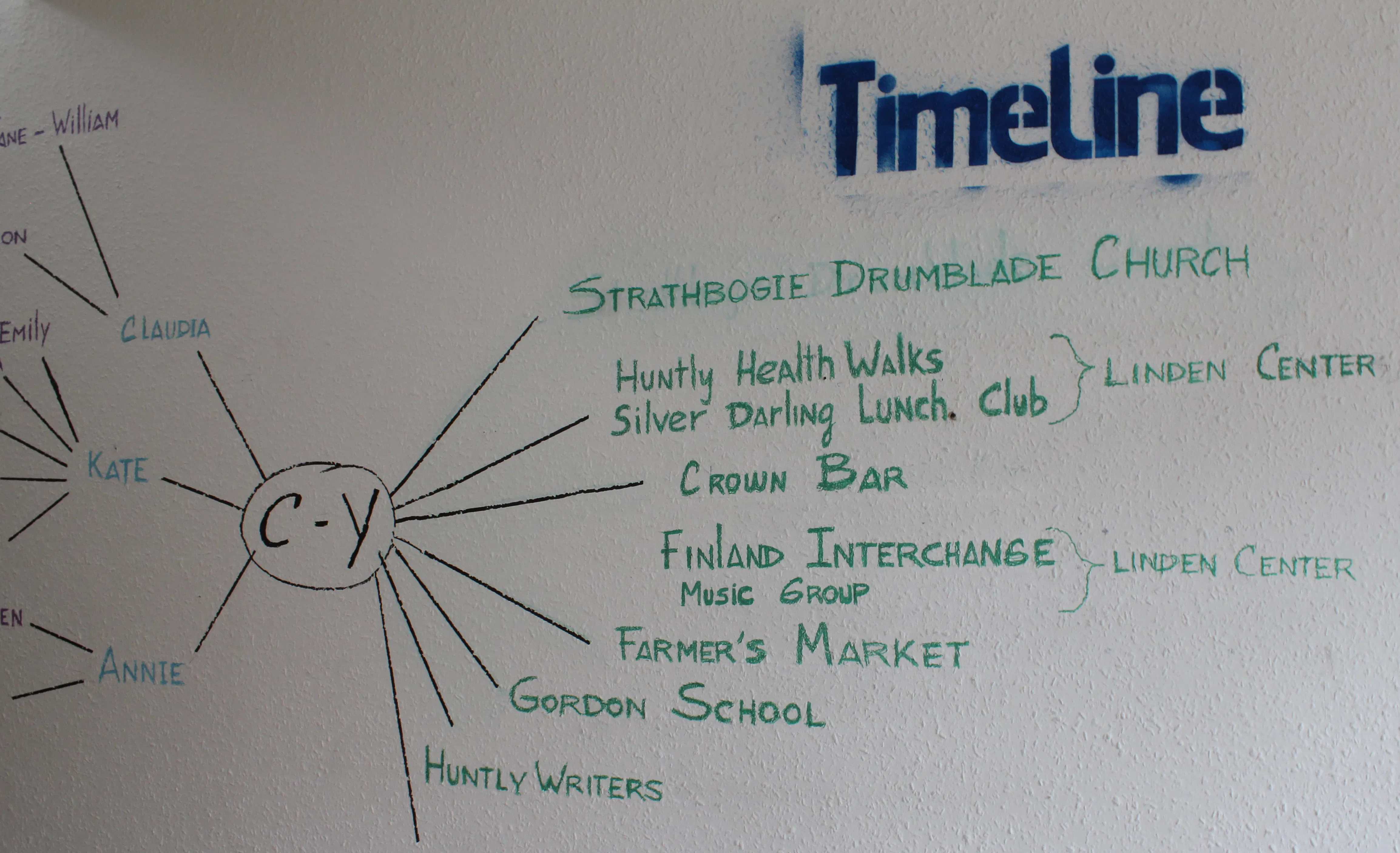 Celia-Yunior aimed to map real friendships in a time of virtual social networks. The project investigated people's relationships in the Facebook era. During their three month residency in Huntly, they gathered information offered by our townfolks' friendships. The place became the space where we could find direct human relations next to cybernet connections. The research resulted in a map that shows the connections among Huntly people and the ways they keep face to face relationships alive.
