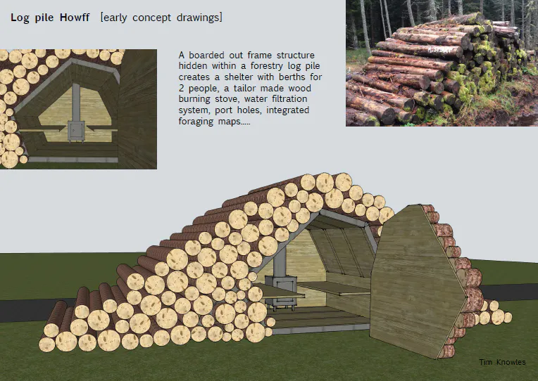 The designed structures were of a 'pop-up' nature; hidden and camouflaged in the landscape with a playful blend of bushcraft, sculptural installation and inventive construction. Each was tailored to its specific location and surroundings and sat considerately in the landscape. The Howffs provided practical support, with the inclusion of basic materials and equipment, and also encouraged reflective and meditative thinking through their design, framed within the land.