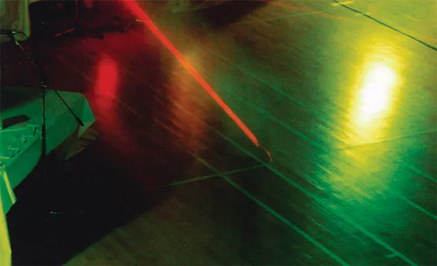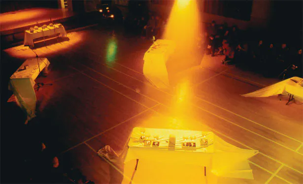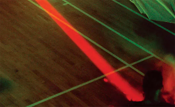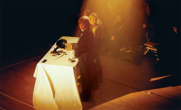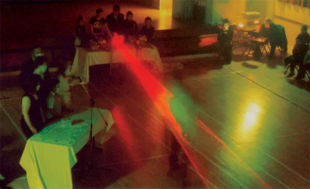 Umesh's project derived some influence from the Ingmar Bergman classic film, The Seventh Seal, in which a journeying knight passes through plague infested towns and duels with Death over a game of chess. His quest is one of a search for God and the meaning of life. The knight's close proximity with death and the passing of time inspires this kind of contemplation and shapes his journey to come (he becomes more enthralled in this game and its negotiations than he does with living the rest of his life). The idea of travel and linear narrative (time) was represented in Umesh's final performance,Here and There, through the use of lasers and sound. The performance ended with the sound of a screaming train, conjuring up the image of movement and a continuous journey. This was preceded by audience participation in which they represented characters from various generations and aspects of life and death. As a result the intersecting layers all converged to reveal a dense narrative about the journey from birth to death, and all the points in between.
